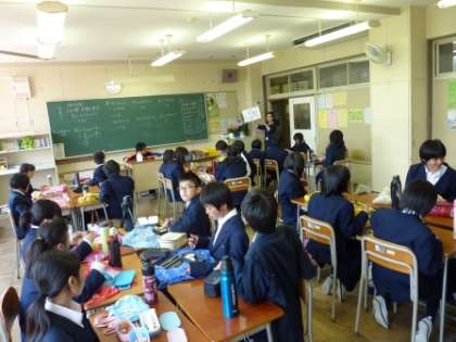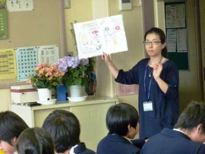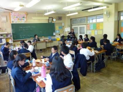 八王子市役所学事課給食担当の方が来校し、本校の中学校給食の実施状況を視察しました。昼食時には、1年1組、2組の教室で、「栄養バランス」について、資料を用いながら説明がありました。