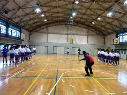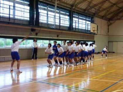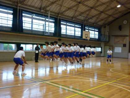 2年生も雨のため、体育館での練習です。5校時は、「大縄跳び」の練習です。「せーの!」の掛け声とともに跳びます。続けて跳べるようになるまで、何回もやり直しです。先生から縄の回し方をアドバイスしてもらったり、並び方などを工夫しています。1組、2組とも、当日はぜひ、今までの体育祭の記録を更新してもらいたいですね。