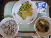 きなこあげパン白菜のクリームスープカリカリじゃこサラダ牛乳表面をカリカリに揚げて、きなこをからめた「きなこあげパン」は、リクエストをとると、いつも上位の人気献立です。