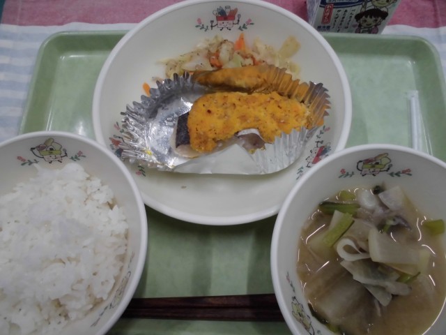 今日の献立は、ごはん・夕焼小焼やき・根菜汁・ごまじゃこあえ・牛乳です。10月1日は、都民の日と八王子市の市制記念日です。童謡の「夕焼小焼」は、上恩方町出身の中村雨紅先生が作詞しました。夕焼小焼やきは、夕焼小焼をイメージして作った料理です。夕焼け色の人参を入れたマヨネーズソースを魚の上にかけて焼きました。