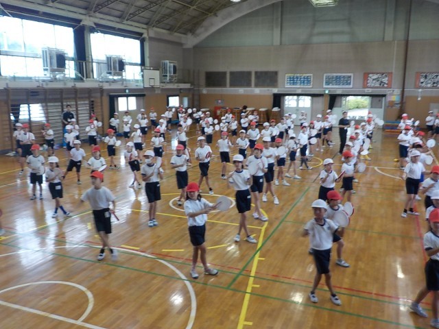 体育館では、3・4年生が太鼓を使って表現運動の練習を行っていました。