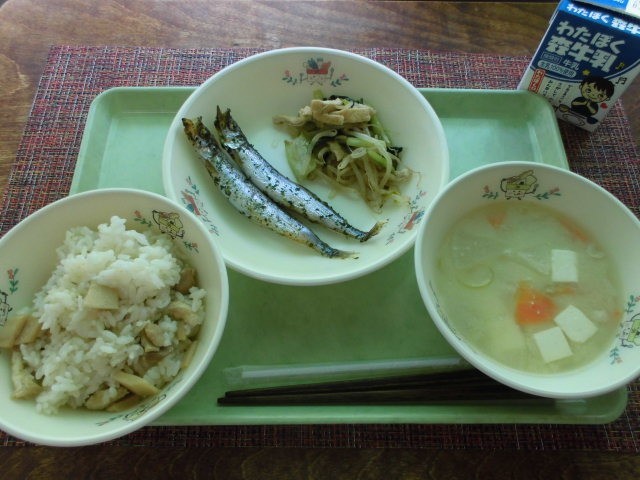 今日の献立は「たけのこごはん」「ししゃもの磯辺焼き」「呉汁」「小松菜と油揚げの煮浸し」です
