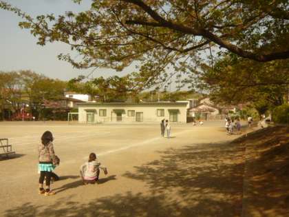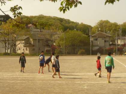 青空の下、子供たちが、元気に校庭で遊びます。