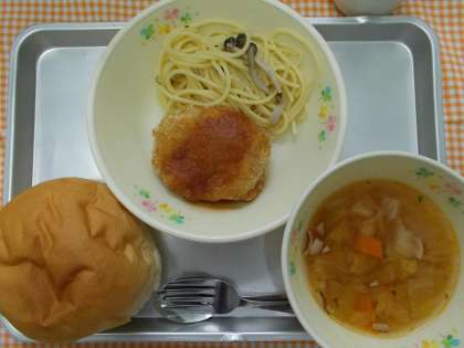 ♪バーガーパン ポテトコロッケ ペペロンチーノ ミネストローネスープ 牛乳♪