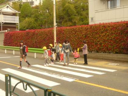 正門の前の横断歩道では、地域の方が、黄色の旗をもち、子供たちの登校を見守ってくださっています。