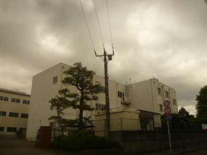 横山第一小学校の校舎の上には、重たい雲が一面に広がります。
