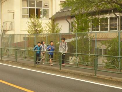 歩道を歩きながら、子供たちの登校を見守ります。