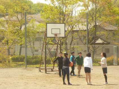 バスケットゴールのそばで遊んでいるのは、高学年の子供たちです。