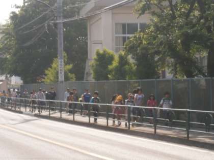 反対側の歩道に、子供たちの姿が見えます。