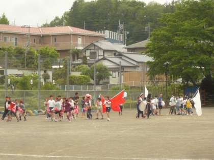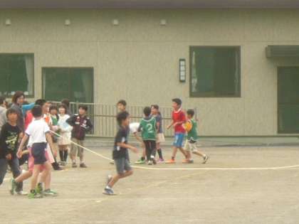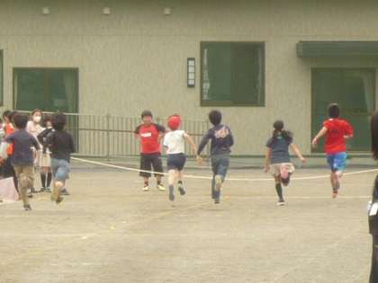 ゴールした子供たちを、ゼッケンをつけた子供たちが、迎えます。