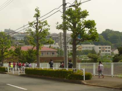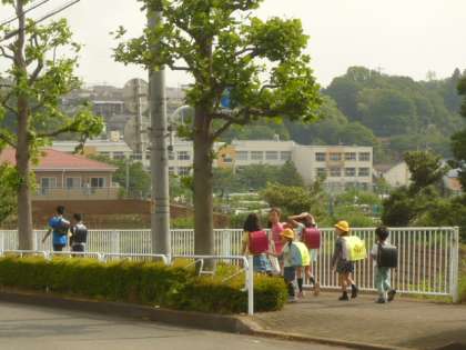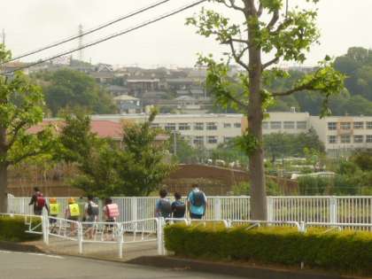 子供たちの遠く向こう側には、横山第一小学校が見えます。