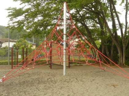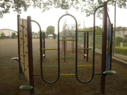 校庭の周りには、遊具や固定施設が設置されています。