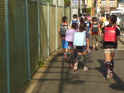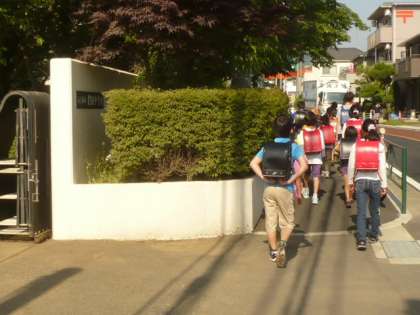 高学年を先頭に、地区班ごとに並んで、歩いてきます。