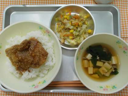 明日はいよいよ運動会です。そんな頑張ってる子どもたちを応援して味噌カツドンにしました。どこからかジャンケンの声が聞こえてきました。負けてカツが食べられなかった子どもも、明日の勝負で「カツ」と言っていたそうで、担任がおしえてくれました。燃えていますね。