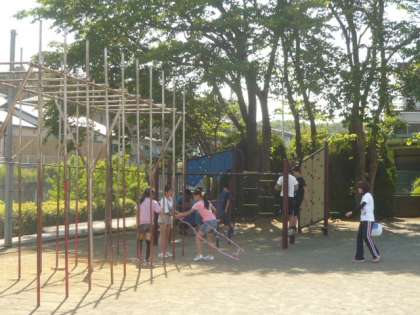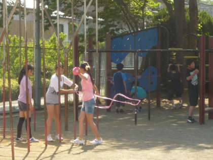 先生「遊具で遊ばないように、スズランテープを巻きま〜す!」