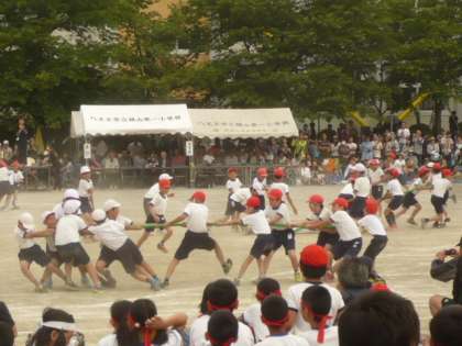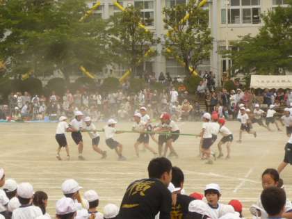 校庭の真ん中に並べられた棒を、赤白の分かれた子供たちが、引き合う競技です。