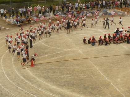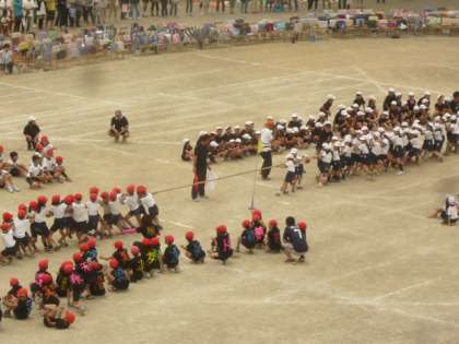 たくさんの子供たちが、校庭の真ん中で綱を引き合います。