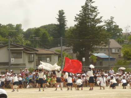 大きな旗を持った応援団員が、児童席の前を走り抜けます。