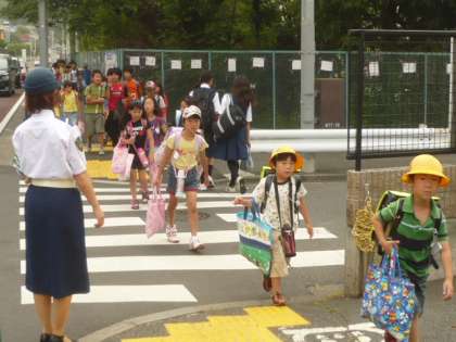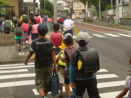 横断歩道では、黄色の旗をもち、安全に配慮してくださっています。