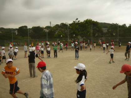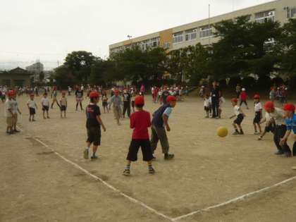 横山第一小学校の校庭で、全校児童が遊んでいます。
