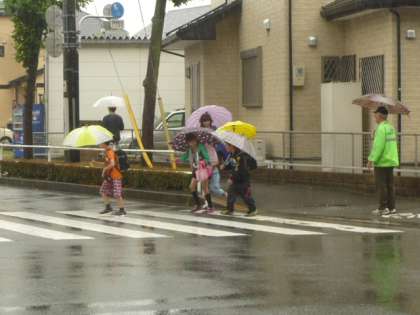 雨の日でも、安全ボランティアの方々が、子供たちの登校を見守ってくださっています。