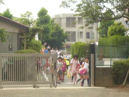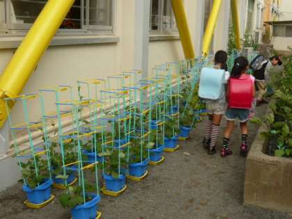 1年生の子供たちは、自分の「アサガオ」を自慢したいのです。