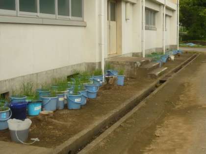体育館とプールの間には、たくさんのバケツが置いてあります。