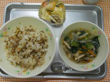 ししじゅうしは、沖縄風のまぜごはんで、生姜がはいっていますので、食欲がでるご飯です。夏野菜はナスやかぼちゃ、トマトにじゃがいもや玉ねぎをマヨネーズであえてから、チーズをふり焼きました。野菜の水分がでてきて少し水っぽくなってしまいましたが、これらの野菜は体を冷やして夏バテをふせぐ野菜です。