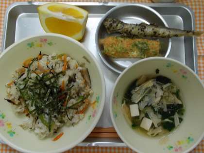 ♪かやくごはん ちくわとししゃもの二色揚げ ゆばのすまし汁 くだもの(宇和ゴールド) 牛乳♪