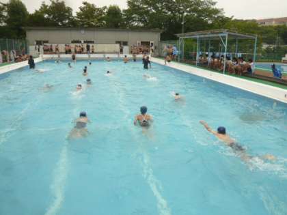 プールの周りには、保護者・地域の方々の姿も見えます。