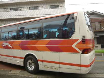 子供たちが、バスの中から、窓越しに手を振ります。