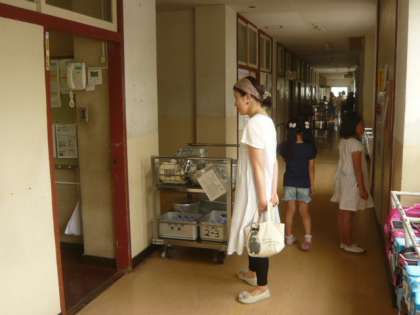 栄養「それでは、各クラスの給食の準備の様子を見てください。」