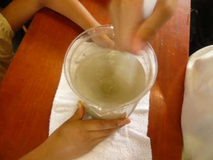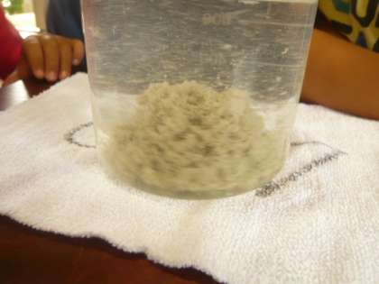 ビーカーの底には、灰色のごみ(?)が、溜まっています。