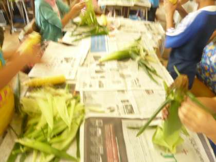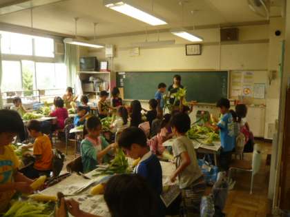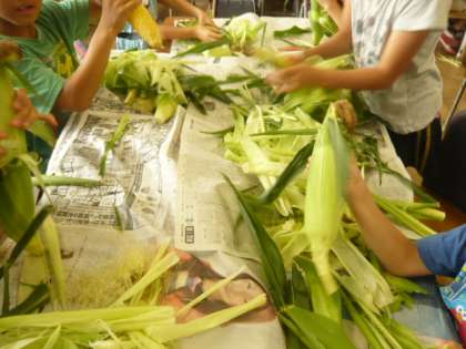 トウモロコシの皮をむいてみよう! 食育(7月7日 3年生編)PART1