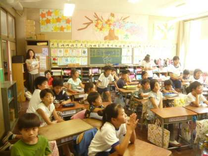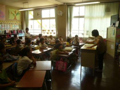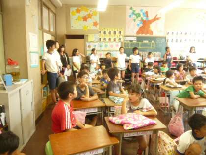 放送「班長さんたちは、1年生、2年生をそれぞれの教室まで迎えに行ってください。」