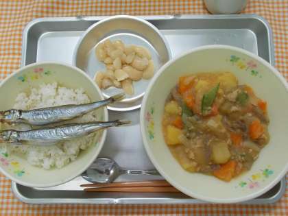 ♪ごまごはん じゃがいものそぼろ煮 焼きししゃも 白インゲン豆のにまめ 牛乳♪