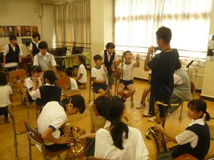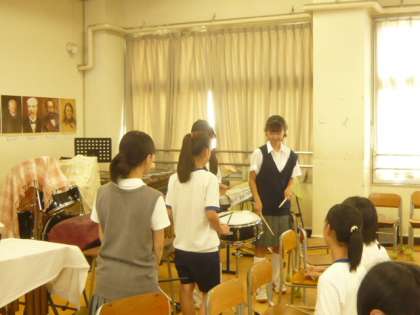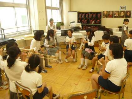 音楽室では、ブラスバンド部が部活動体験を行っています。