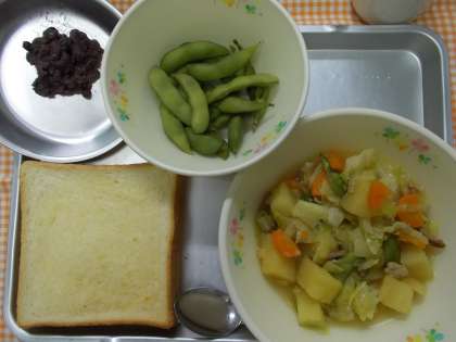 食パンにバターをぬりトーストにしたものに、小豆の煮物をのせてたべます。甘いものにスープのカレー味がとてもあっていておいしかったです。スープには、削り節でだしをとり、肉や野菜のうまみがでてよい味にできました。