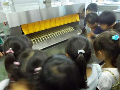 今日は1年生による給食室探検の日です。普段入れない給食室ですが、今日だけは誰でも入って見学ができます。子どもたちは、給食室の器械を見てふれたり、体験をさせてもらったりして、満足そうに教室にもどっていきました。
