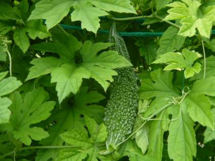 緑色の葉っぱに隠れて、ゴーヤがぶら下がっています。