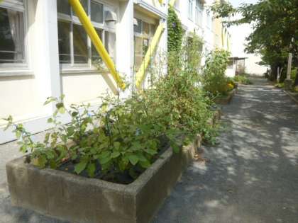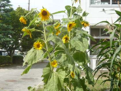 花壇の端には、小さなひまわりの花が、咲き始めています。