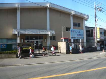 北野街道沿いの歩道を、子供たちが歩く姿が見えます。
