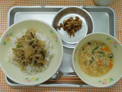 ♪スタミナどん じゃがたまスープ 豆ナッツこくとう 牛乳♪
