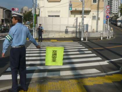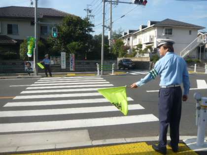 黄色い旗を持った交通指導員の方が、さっと、横断歩道を確認します。