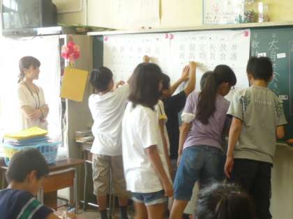 先生「上に書いてある熟語と、下に書いてある漢字を結びつけます。」