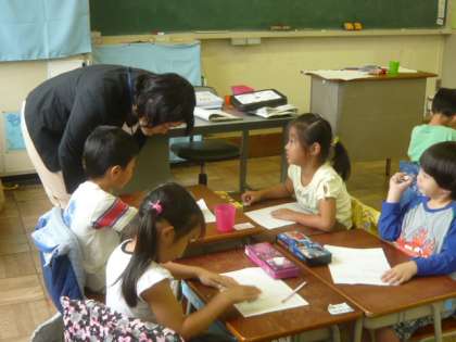 子供たちと同じ視線になるためには、しゃがみながら話をします。