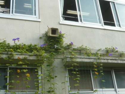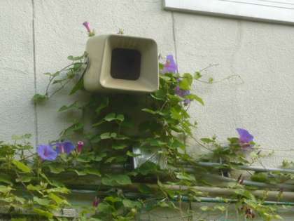 校舎の壁面に設置してあるスピーカーのそばにも、アサガオが咲いています。