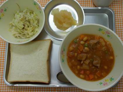 りんごにパインをいれて色止めをしながら、弱火で煮込みました。調味料はさとうのみです。生のふじりんごもおいしくてジャムらしく出来上がりました。市販のジャムには、日持ちがするように食品添加物やでんぷんがはいっていますので、ねっとりとしていますが、給食では調味料はさとうのみです。安全な取り組みをしています。