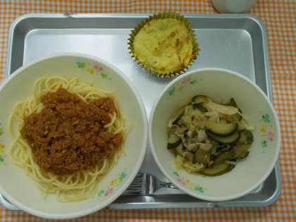 ♪スパゲティミートソース きゃべつときゅうりのぴりから和え スィートポテト 牛乳♪