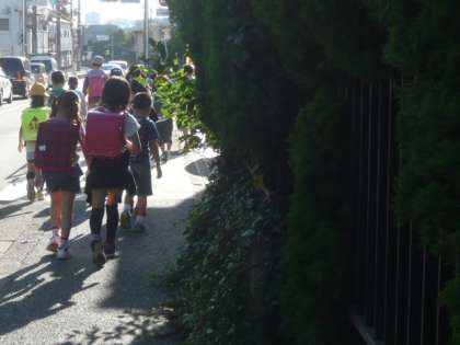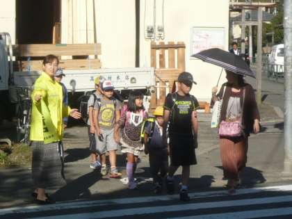 ゆりのき台の交差点でも、保護者の方々が、子供たちの登校を見守ってくださっています。